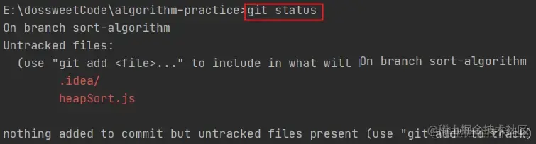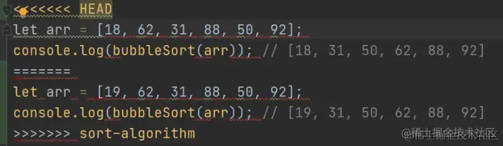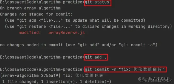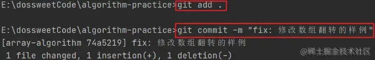 回到我们的项目中,本地切换分支到array-algorithm,小修改一下代码,然后重新执行commit:
