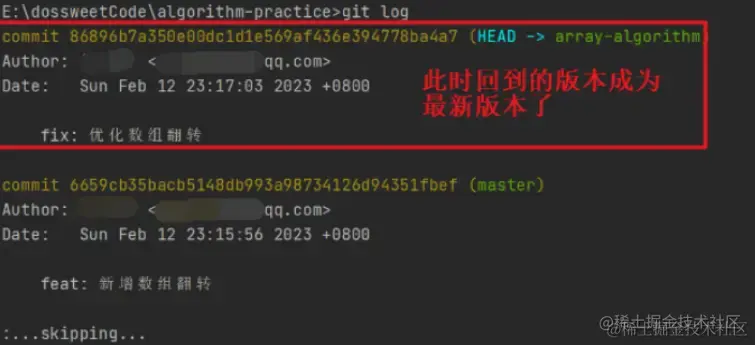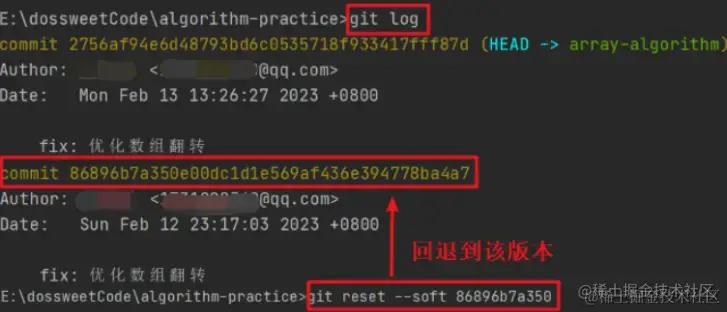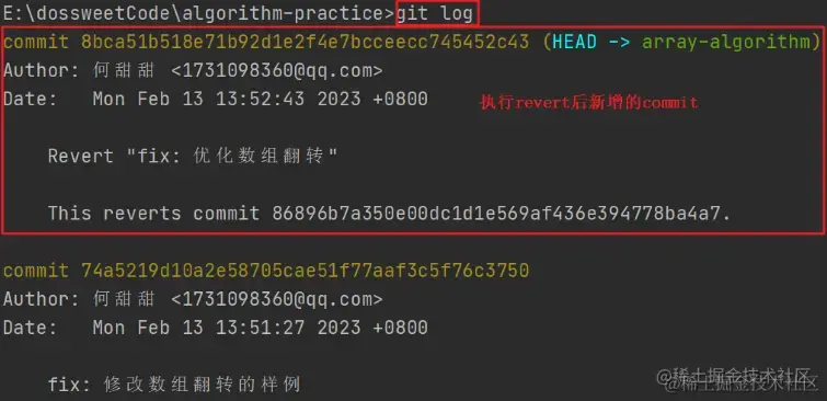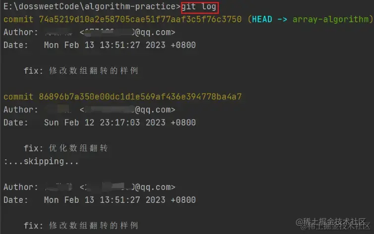 回到我们的项目中,在array-algorithm分支上,小修改一点代码。然后commit内容到本地仓库: 接着执行一下git log查看一下本地提交记录:
