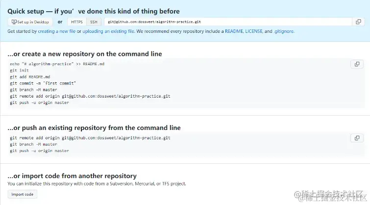 因为此时的云仓库里啥都没有,github就会出一些提示来帮助远程仓库和本地仓库建立连接: 按照图中的说法,本地仓库和云端仓库建立连接有两种办法: