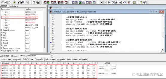 执行R1-R12内容压栈后本模式堆栈相关内存单元的数值如上图所示,可知压栈后,堆栈指针变为0x8354,离初始的堆栈指针0x30字节,即12个字(32位系统),从内存单元的数值可以看到分别与R1-R7存储的数值对应,说明该模式下仅能压入R1-R7,因为快速中断模式有自己的R8-R12。