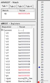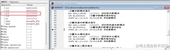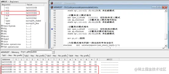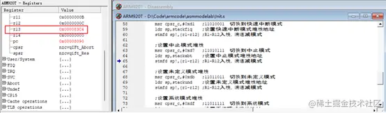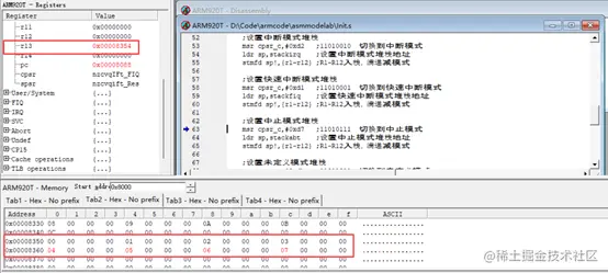 执行R1-R12内容压栈后本模式堆栈相关内存单元的数值如上图所示,可知压栈后,堆栈指针变为0x8394,离初始的堆栈指针0x30字节,即12个字(32位系统),从内存单元的数值可以看到分别与R1-R12存储的数值对应。