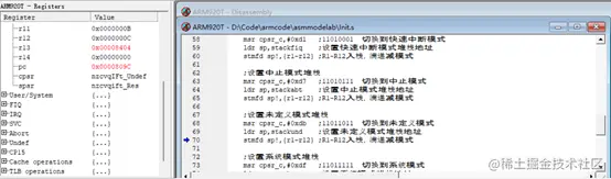 (1)按照2.3节介绍的方法, 在ADS下创建一个工程asmmodelab,完成各个模式下的堆栈初始化工作,并将R1-R12的内容存入当前模式下堆栈。通过AXD运用单步执行方式调试程序,验证工作模式的切换,注意观察CPSR寄存器中的变化。随着程序调试过程中在模式间的切换,使用寄存器观察器切换到不同的工作模式下观察SP(R13)的变化情况。