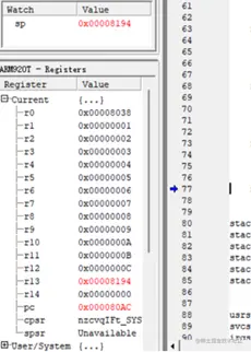 执行R1-R12内容压栈后本模式堆栈相关内存单元的数值如上图所示,可知压栈后,堆栈指针变为0x8194,离初始的堆栈指针0x30字节,即12个字(32位系统),从内存单元的数值可以看到分别与R1-R12存储的数值对应。