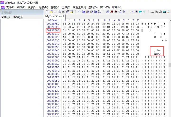 从WinHex 上看,果然是在偏移为 0x00230000 这个数据页上。