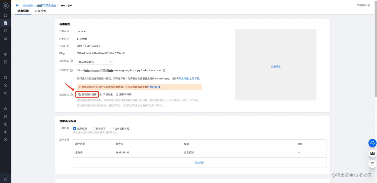 方法一:在对象信息中复制临时链接,该临时链接携带有效期为1小时的签名参数;