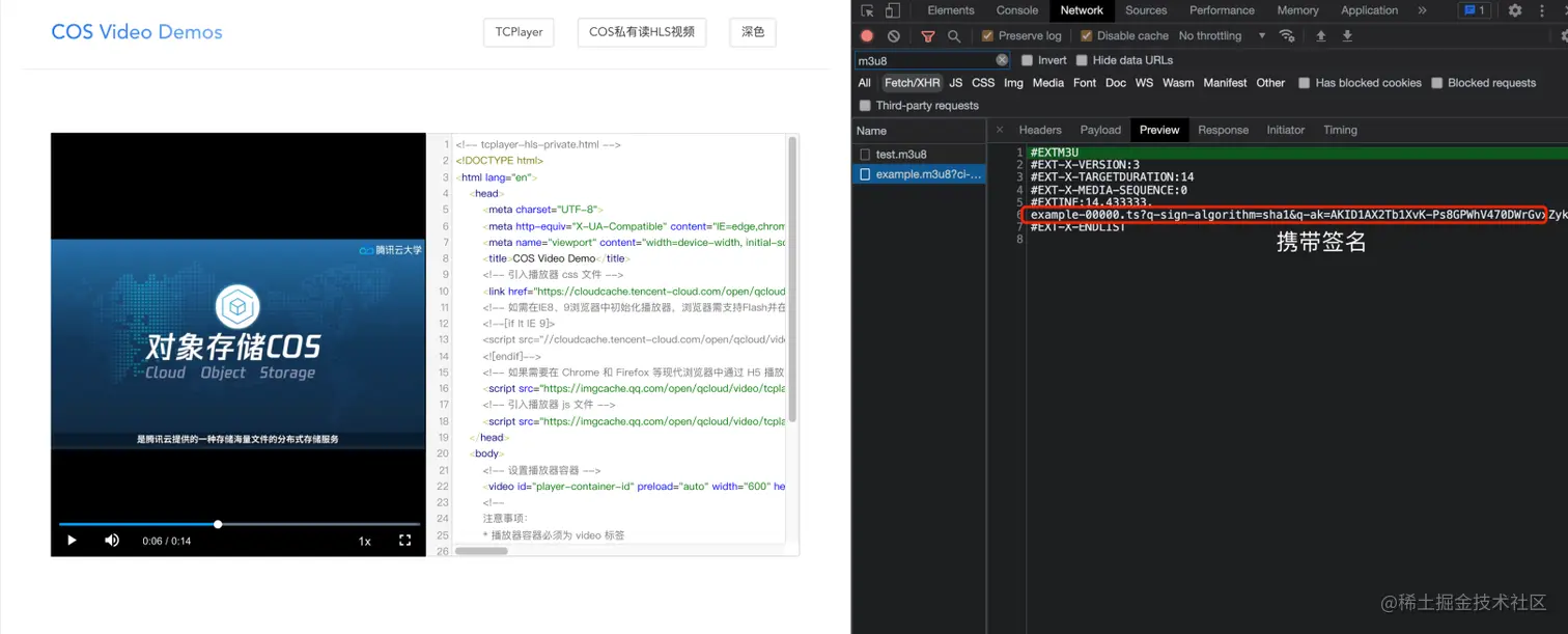 2.3 结合前面的步骤流程,利用TCPlayer播放 私有读 HLS 视频文件地址,完整代码如下: