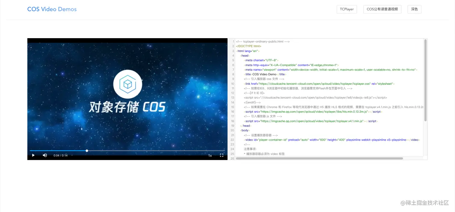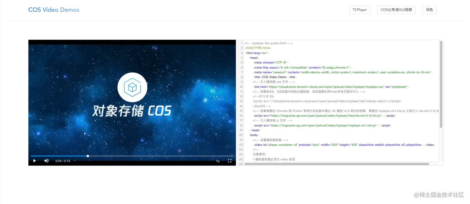4、结合前面的步骤流程,利用TCPlayer播放公有读 HLS 视频文件地址,完整代码如下: