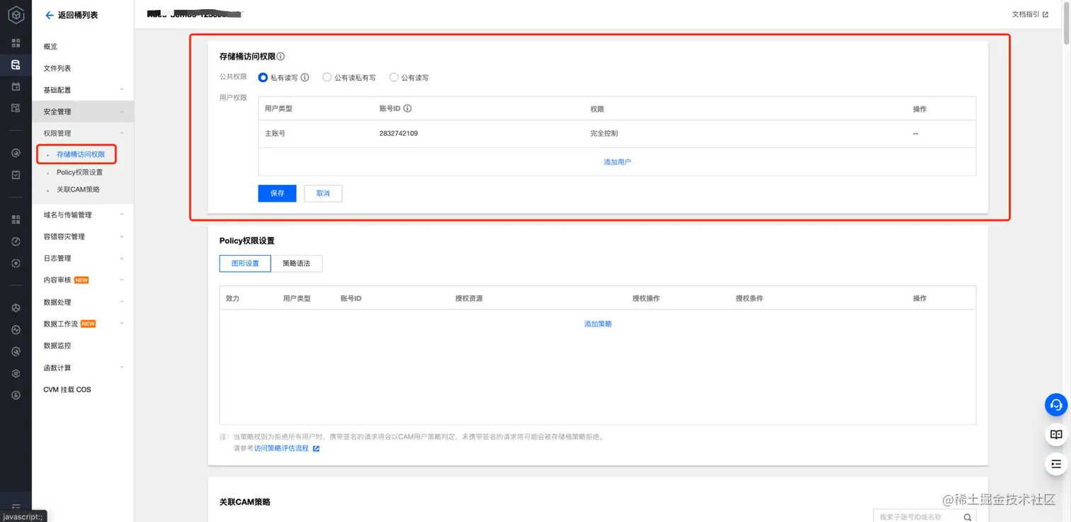 为了保障存储桶数据的安全性能,一般推荐将存储桶设为私有读写权限。此时只有该存储桶的创建者及有授权的账号才对该存储桶中的对象有读写权限,其他任何人对该存储桶中的对象都没有读写权限。