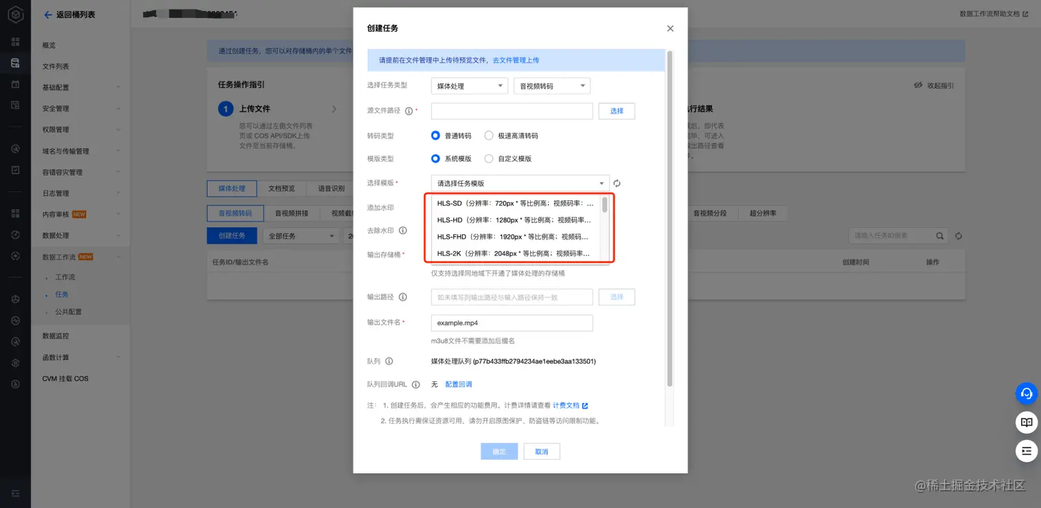 2、选择系统模版中的任一 HLS 转码任务,配置任务生成 HLS 视频文件;