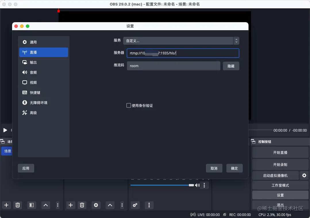 - 在直播->服务器这⾥,输⼊srs的地址:rtmp://xxx.xxx.xxx.xxx:1935/hls (注意这⾥不要带room,另外将localhost替换成本地的ip地址), 然后在串流密钥这⾥,才是输⼊room