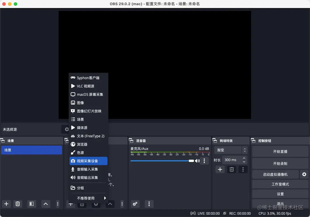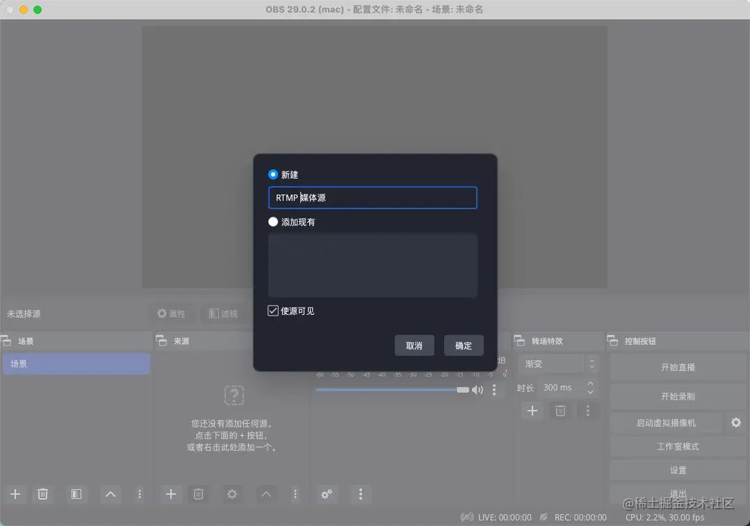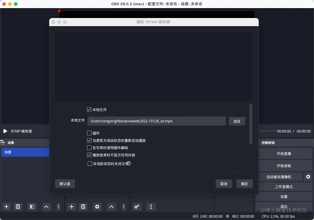 如果不擅长使用ffmpeg的命令方式,也可以使用客户端来进行操作,推荐使⽤主流的OBS开源推流软件,可从官⽹obsproject.com/ 下载最新版本,⽬前很多⽹络主播都是⽤它做直播。该软件⽀持本地视频⽂件以及摄像头推流。