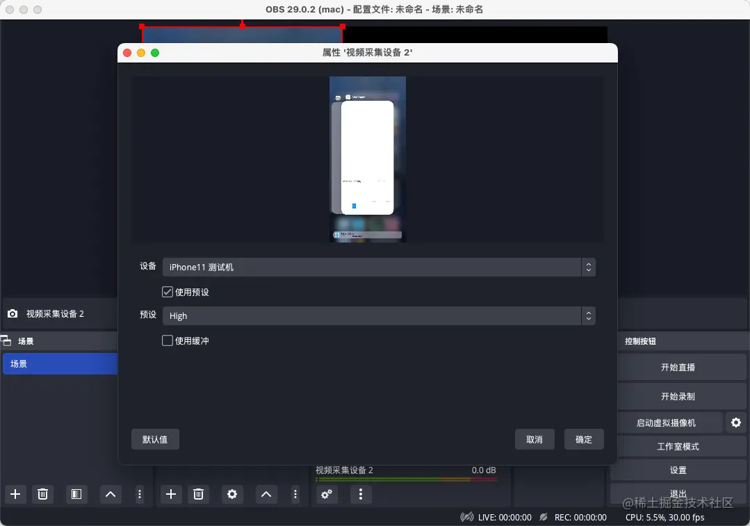 - 选择摄像头设备,这里我使用的是mac,所以使用了usb连接的手机摄像头