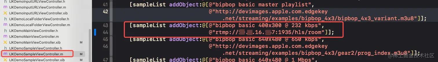 修改demo中的某个m3u8播放地址。我这里修改的是:IJKDemoSampleViewController示例中的播放地址: