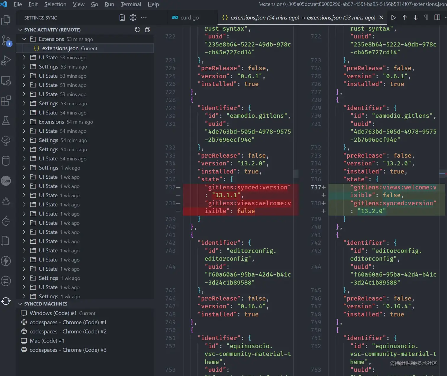 使用 Github 登录即可使用,同步极为细致,如图可见。最关键的是插件状态也能很好的同步。像 marketplace.visualstudio.com/items?itemN… 这个插件存储的代码片段也在 extension.json 文件里,则也走这个同步。