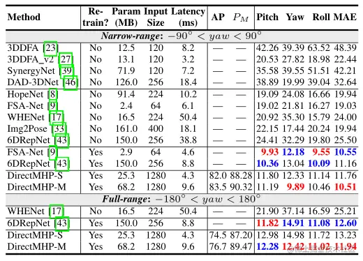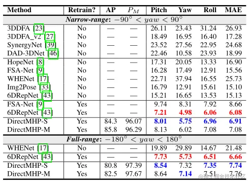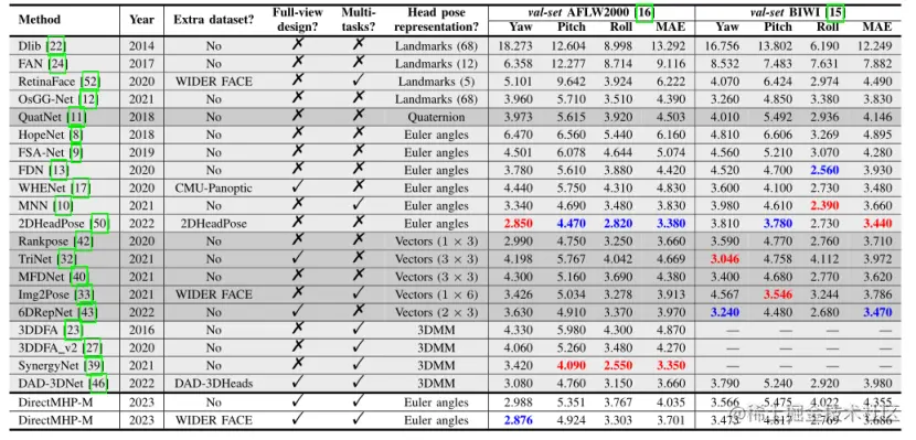 DIRECTMHP-M与在300W-LP 数据集上训练的方法的比较(红色表示最好的结果,蓝色表示第二好的结果):