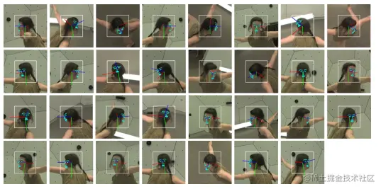 首先通过封闭形式的解决方案从具有精确正面视图和预定义相机参数Cref的通用头部模型Href计算相似变换矩阵Mc。在Hreal和Href中精心选择N0对角地标进行对齐。然后,使用Mc松散地围绕每个头部定义一个变换后的3D半球,并通过具有真实相机参数Creal的2D投影生成其边界框,以获得包含背景和整个头部的区域。最后,为了提取头部方向,估计从相机世界Ccam到现实世界Creal的变换矩阵 Mr。Mr计算如下: