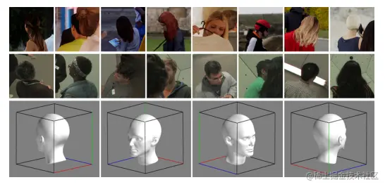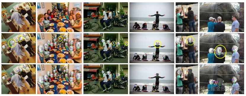来自 COCO val-set 的一些野外图像的可视化如下图所示。第二行和第三行分别是比较6DRepNet和本文方法的例子。使用6DRepNet估计的头部样本有明显的不准确(黄色圈出)。