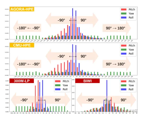 目前,两个最广泛使用的 HPE 数据集BIWI和300W-LP仅包含窄范围偏航角(-99°,99°)的头部姿势标签。现有 HPE 方法的性能在这些基准上趋于饱和。然而,覆盖全范围偏航角(−180°、180°)的 HPE 方法因此同样具有重要的应用价值。