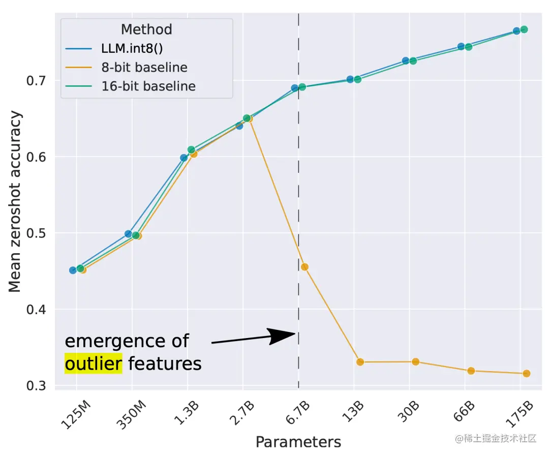 随着模型参数规模继续增长到数十亿的级别,高量级的离群特征开始在所有 transformer 层中出现,导致简单的低位量化效果不佳。 Dettmers 等人观察到大于 6.7B 参数的 OPT 模型就会出现这种现象。模型大了,有极端离群值的网络层也会变多,这些离群值特征对模型的性能有很大的影响。在几个维度上的激活函数异常值的规模就可以比其他大部分数值大 100 倍左右。