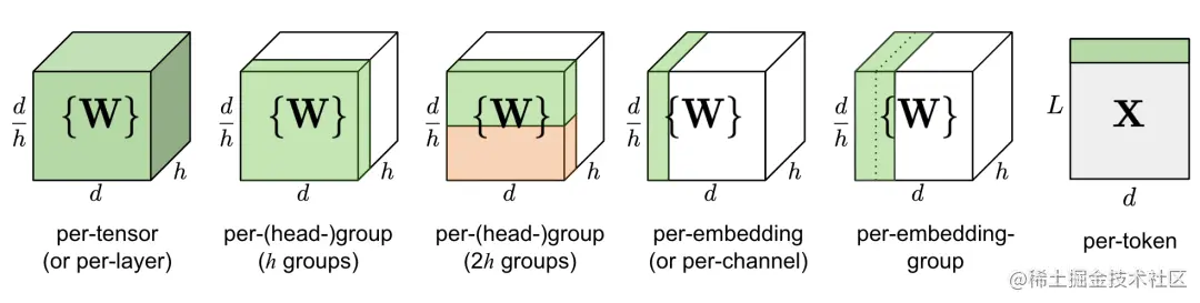 简单地量化一层中的整个权重矩阵(逐个张量或逐个层量化)是最容易实现的,但量化粒度往往不尽如人意。