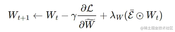 STE 的扩展版本 SR-STE(稀疏精化 STE)通过以下方式更新稠密权重 W: