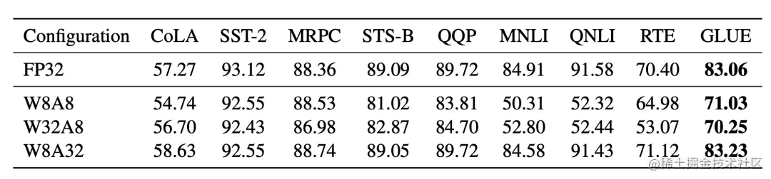 激活函数量化为 8 位时,无论权重是否为低精度(W8A8 和 W32A8)效果都不如 W8A32。