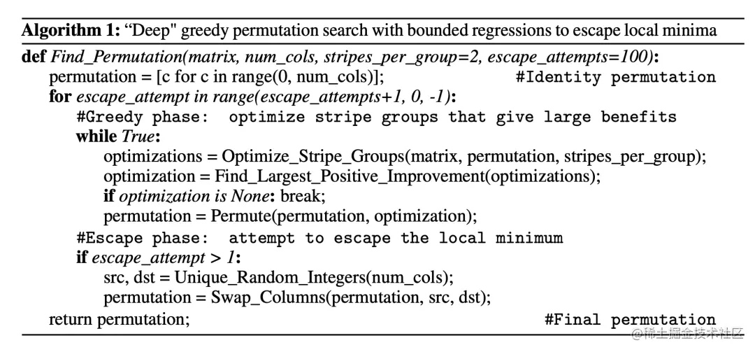 Pool 和 Yu 提出了一种迭代式的贪心算法来寻找最优排列,使 N:M 稀疏化的权重幅度最大化。所有通道对都被推测性地交换,并且只采用幅度增加最大的交换,然后生成新的排列并结束单次迭代。贪心算法可能只会找到局部极小值,因此他们引入了两种技术来逃避局部极小值: