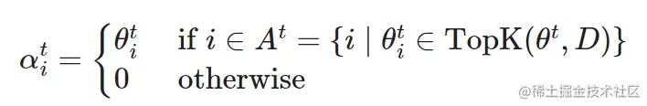稀疏前向传递:选择参数的一个子集,包含每层按大小排列的前 K 个参数,限制为权重的前 D 比例。如果时间 t 的参数化 α^t 不在 A^t(活动权重)中,则参数化为零。