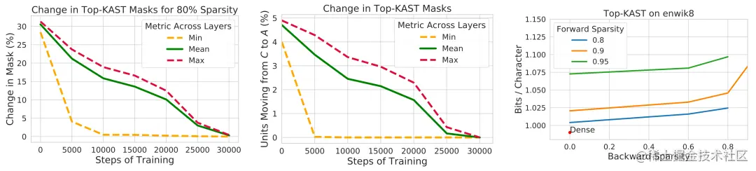 与 STE 或 SR-STE 不同,Top-KAST 方法可以在前向和反向传播的整个训练过程中保持恒定的稀疏性,还不需要使用具有稠密参数或梯度的前向传播。