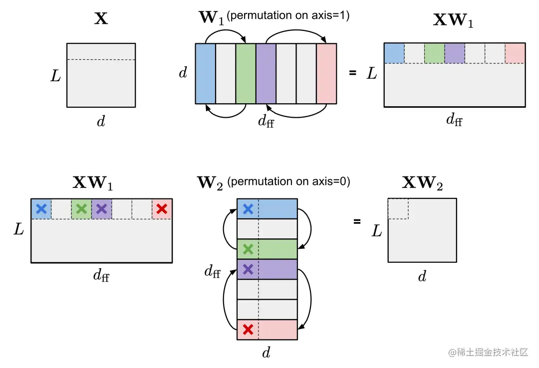 图 8. W_1(轴 1)和 W_2(轴 0)上有着相同的排列,可以保持 FFN 层的输出不变。为简单起见,图示省略了偏差项,但也应对它们应用相同的排列。