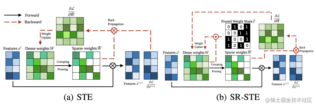 图 10. STE 和 SR-STE 的对比。⊙的比较是元素乘积;⊗是矩阵乘法。
