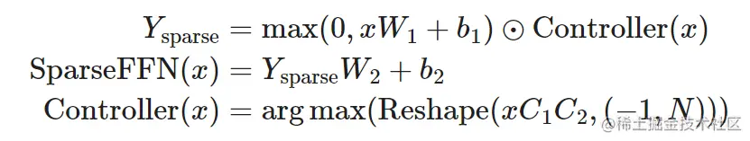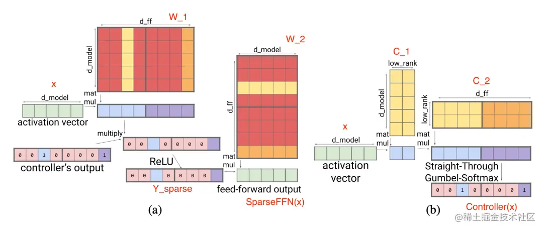 其中 (sparse ) 中的每个激活函数结果对应于 W_1 中的一列和 W_2 中的一行。控 制器是一个低秩的 bottleneck 全连接层, 其中 、 .在训练期间使用 argmax 进行推理以选择哪些列应为非零和, 以及 Gumbel-softmax 技巧。因为可以在加载 FFN 权重矩阵之前计算 Controller ( ), 所以可以知道哪些列将被清零, 因此选择不将它们加载到内存中以加快推理速度。