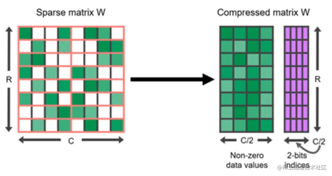 图 6. 2:4 结构化稀疏矩阵及其压缩表示。