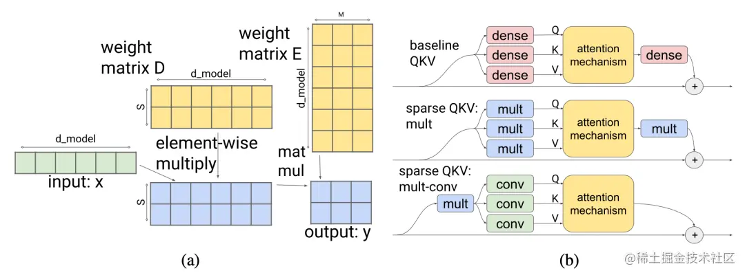 稀疏注意力层:在注意力层中,维度 d_(model) 被划分为 S 个模块,每个模块的大小为 M=d_(model)/S。为了确保每个细分都可以访问嵌入的任何部分,Scaling Transformer 引入了一个乘法层(即,一个乘法层将来自多个神经网络层的输入按元素相乘),它可以表示任意排列,但包含的参数少于全连接层。