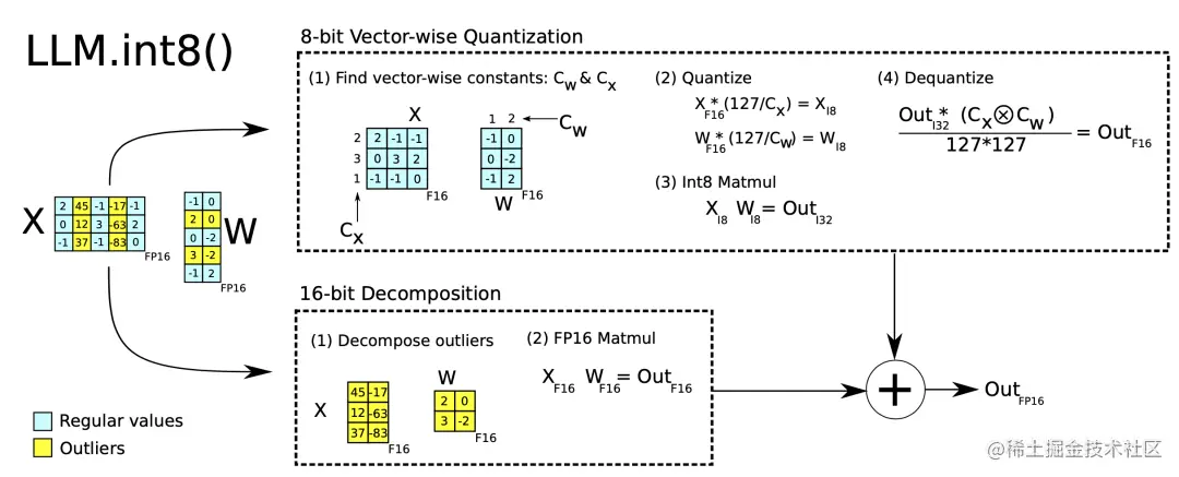 LLM.int8 () 中的混合精度量化是通过两个混合精度分解实现的:
