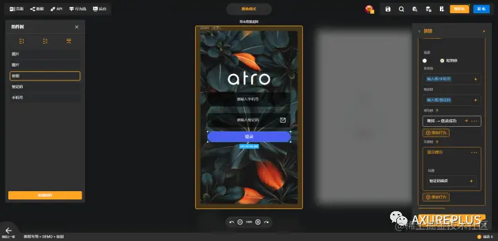 下一步我们为登录按钮,增加一个“校验验证码”的行为,我们使用相同的方法,来指定手机号和验证码的 2 个输入框,也用于使用对应的手机号和验证码进行组合校验。在这里,我们同时还设置了“成功后”跳转到仪表盘页面;“失败时”提示验证码错误。