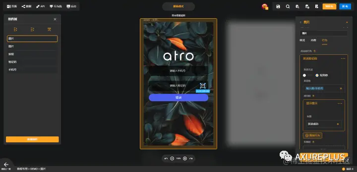 点击“发送验证码”的图片按钮,为其添加“发送验证码”的行为,并且将发送内容设置为“手机号”这个输入框,为的是让程序知道,发送到哪个号码;同时在“成功时”我们添加一个“显示提示”的行为,告知用户验证码已发送成功。