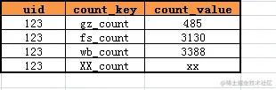 2、冗余计数表采用竖表设计而非横表设计,把列扩展变成了行扩展。即计数表的每个计数属性值不再存在同一条横向记录里,而是把每种属性的技术值单独存一条记录,这样每次增加属性,就只需要增加一条记录即可。
