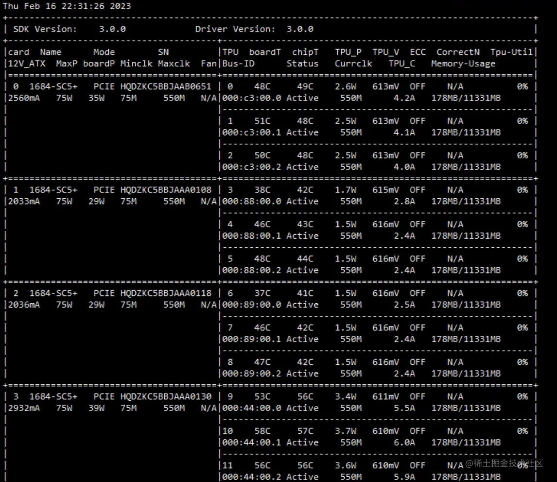从下图也可以看到能正常识别到加速卡,这里需要解释一下为啥是三个BM1684连在一起,首先BM1684是芯片,一块SC5+智算卡中包含三块BM1684芯片,这样就能理解了吧。
