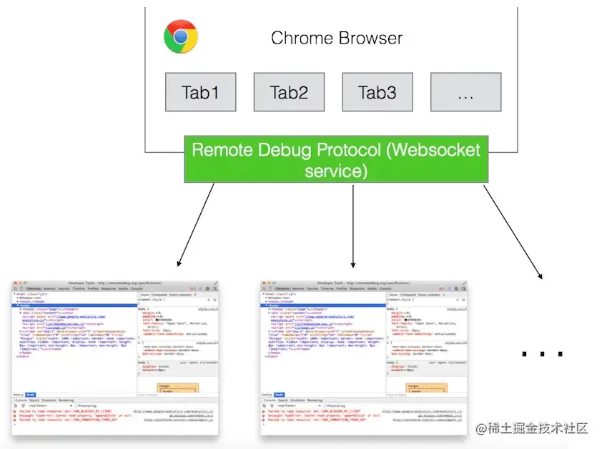- 远程调试协议基于 WebSocket,利用 WebSocket 建立连接 DevTools 和浏览器内核的快速数据通道