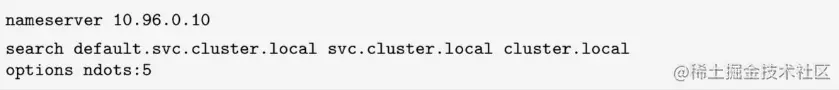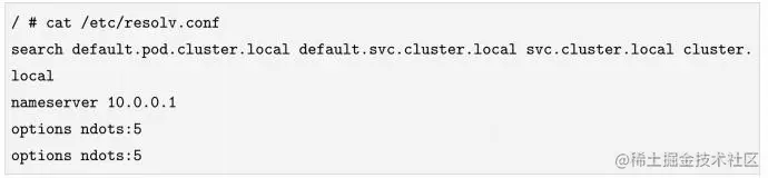 其中,DNS Server的IP地址是10.0.0.1。options ndots:5的含义是当查询的域名字符串内的点字符数量超过ndots(5)值时,则认为是完整域名,直接解析,否则Linux系统会自动尝试用default.pod.cluster.local、default.svc.cluster.local或svc.cluster.local补齐域名后缀。