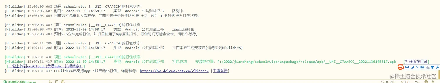 打包的进度查询,则是在下边的编译窗口下,如下截图: