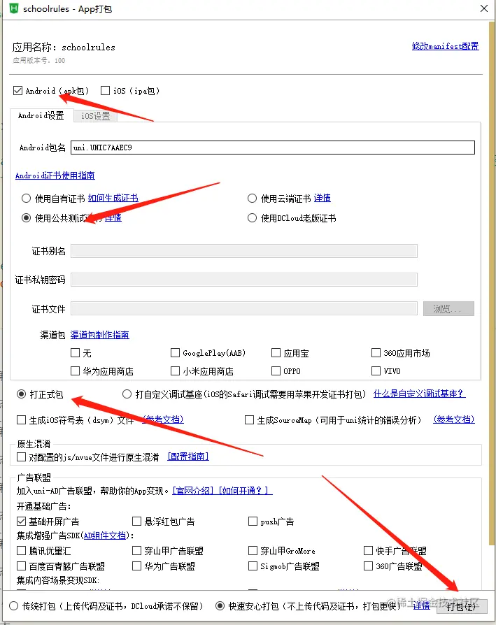 会弹出一个窗口,选择正式打包,公用id ,如下截图: