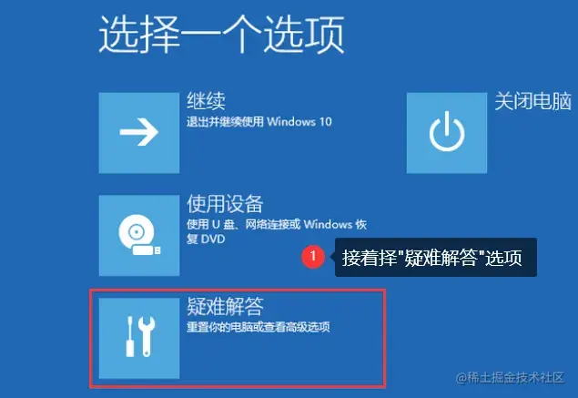第2步: 出现【选择一个选项】的界面,点击【疑难解答】;