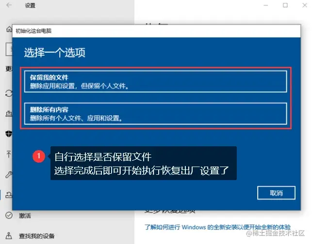 第3步: 之后就可以选择保留文件,或者是删除所有文件(建议还有重要文件的用户,可以选择第一个选项)。选择好后,Win10电脑就开始执行恢复出厂设置。