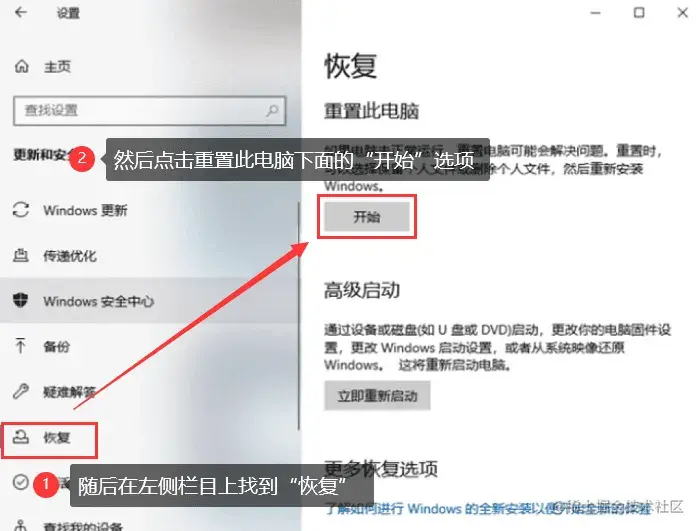 第2步: 在设置主页的左侧,找到【恢复】选项,再点击【开始】;