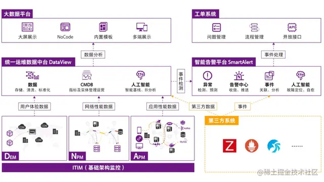 光大银行通过开发测试云、生产云、金融生态云三朵云的全栈云体系建设,全面支持业务的敏捷开发、持续交付和稳定运行,技术栈全面兼容X86架构与国产化ARM架构,全面支持混合云架构,提供两地三中心及异地多活能力,逐步推进行内应用云原生改造步伐,实现以云原生应用为主,传统应用为辅的全栈云技术支撑体系,如图1所示。与此同时,光大还构建了完整的云原生监控体系,实现了从基础架构监控(ITIM)、到应用性能监控(APM)、网络性能监控(NPM)以及用户体验监控(DEM)的全链路监控体系,全面监控云原生环境以及稳态系统中业务运行的稳定性,如图2所示。