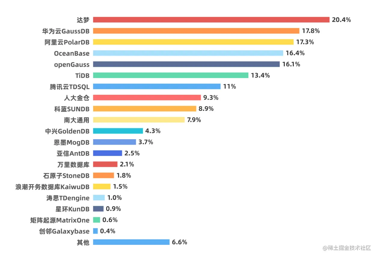 达梦数据库是企业使用率第一的中国数据库,占比达20.4%;华为云 GaussDB、阿里云 PolarDB 分别以17.8%、17.3%的占比紧随其后。其后分别是 OceanBase、openGauss、TiDB、腾讯云TDSQL、人大金仓、科蓝SUNDB、南大通用,这与墨天轮中国数据库流行度排名榜单前十大致保持着一致。