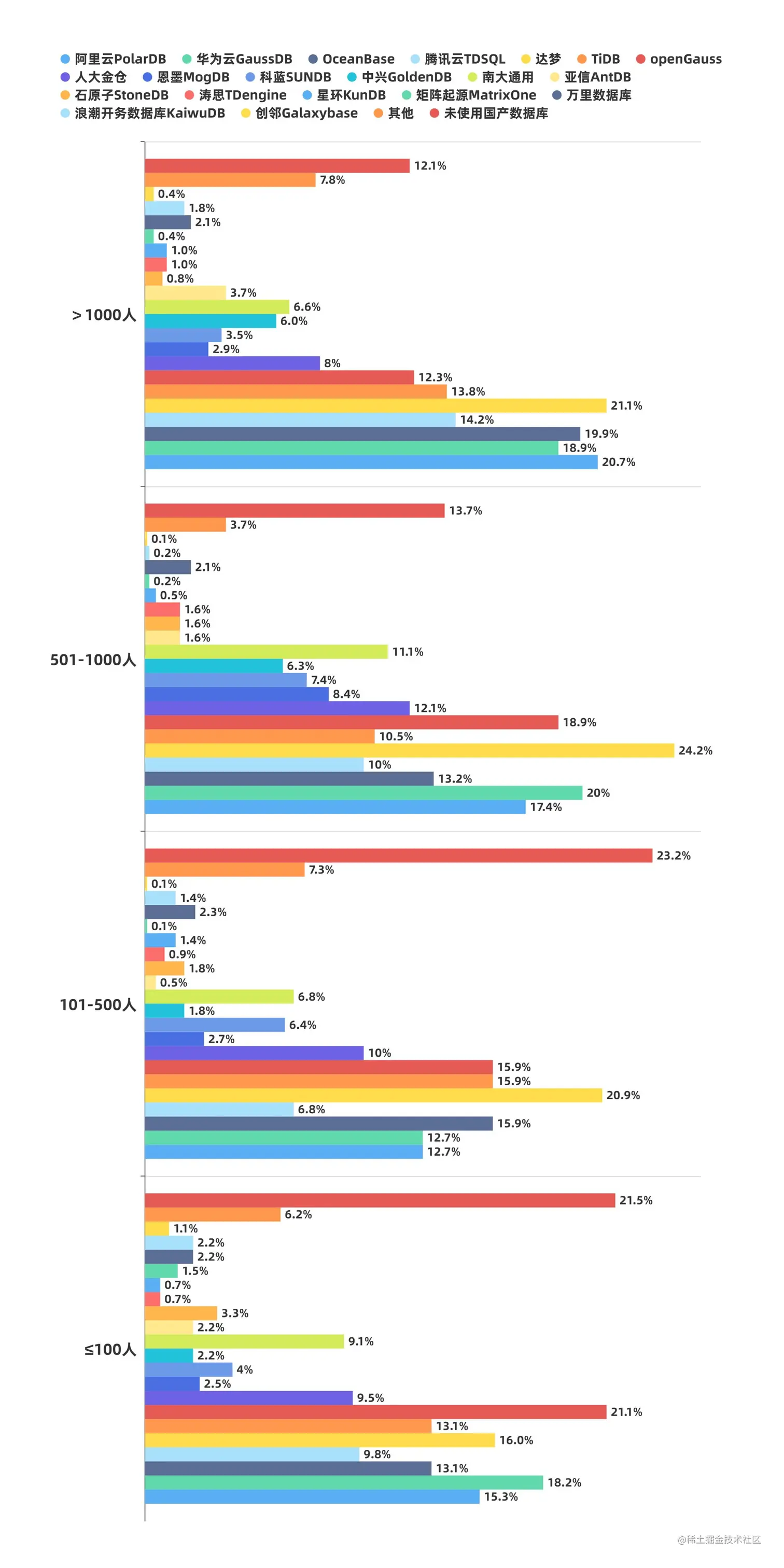 根据调查数据,≤100人的企业中,21.1%的受访者表示,其企业正在使用openGauss 数据库,这说明 openGauss 是微型企业使用率占比最高的中国数据库,openGauss作为一款开源关系型数据库管理系统,生态建设比较完善,能大大降低微型企业的使用成本。而在大于1000人的企业中,达梦、阿里云PolarDB的使用率更多,分别占比21.1%、20.7%,OceanBase、华为云GaussDB紧随其后。