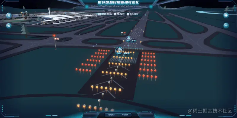 图扑软件应用自主研发核心产品 HT for Web,无缝融合 2D、3D 可视化技术,以青岛胶东国际机场为背景,搭建具有轻量化可交互的 Web 智慧机场 3D 可视化解决方案。围绕机场全域和航站楼两个主要对象,对机坪、廊桥、跑道、飞机、边检海关出入境区、旅客安检区、行李提取区等展开多元可视化呈现。从机场服务能力、运维水平、建设能力、全域协同运行等维度,推进航站楼服务智能化、飞行区少人化、旅客联程联运以及货物联运的数字化管理模式。